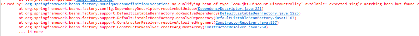 orderservice는 discountPolicy라는 객체를 의존을 받아야 하는데 동일한 타입의 bean이 두개가 등록이 된다면 에러가 발생하게 된다